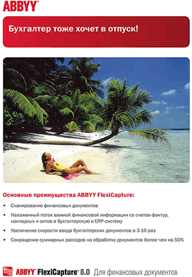 Архив электронных образов счетов-фактур позволит найти и распечатать нужные документы за считанные секунды. Срок возврата инвестиций в ABBYY FlexiCapture составляет от 3 до 6 месяцев.