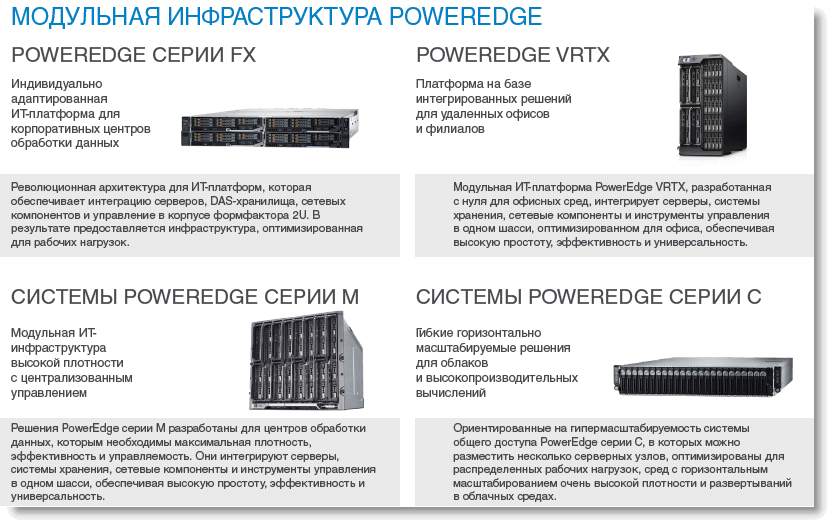Гибкие горизонтально масштабируемые решения для облаков и высокопроизводительных вычислений. Ориентированные на гипермасштабируемость системы общего доступа PowerEdge серии C, в которых можно разместить несколько серверных узлов, оптимизированы для распределенных рабочих нагрузок, сред с горизонтальным масштабированием очень высокой плотности и развертываний в облачных средах. Характеристики и модели