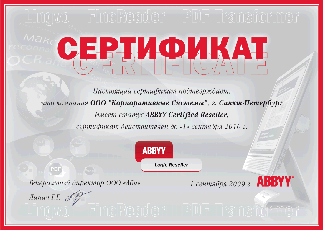 Компания ABBYY подтвердила партнерский статус ООО «Корпоративные Системы». 1 сентября 2009 года генеральный директор Аби, господин Лапич Г.Г., подписал сертификат ABBYY Certified Reseller на 2009-2010 год.