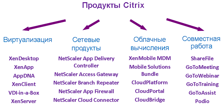 В состав этой группы продуктов Citrix входят решения XenDesktop, XenApp, AppDNA, XenClient ,VDI-in-a-Box,XenServer ,предназначенные для виртуализации серверов, графических рабочих столов и приложений, с целью сконцентрировать все вычислительные мощности организации и управление ими в центре обработки данных и доставлять конечным пользователям приложения по запросу. Подробнее
