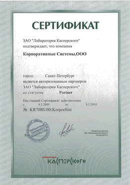 ООО «Корпоративные Системы» получило сертификат, подтверждающий, что компания является авторизованным партнёром ЗАО «Лаборатория Касперского» со статусом Partner.