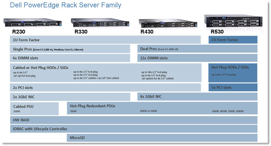 | PowerEdge R230 | Однопроцессорный стоечный сервер форм-фактора 1U обеспечивает высокую производительность и эффективность для небольших предприятий. | Процессор Intel Xeon семейства E3-1200 v5, Intel Pentium, Intel Core i3 | До 4 модулей DIMM памяти DDR4
